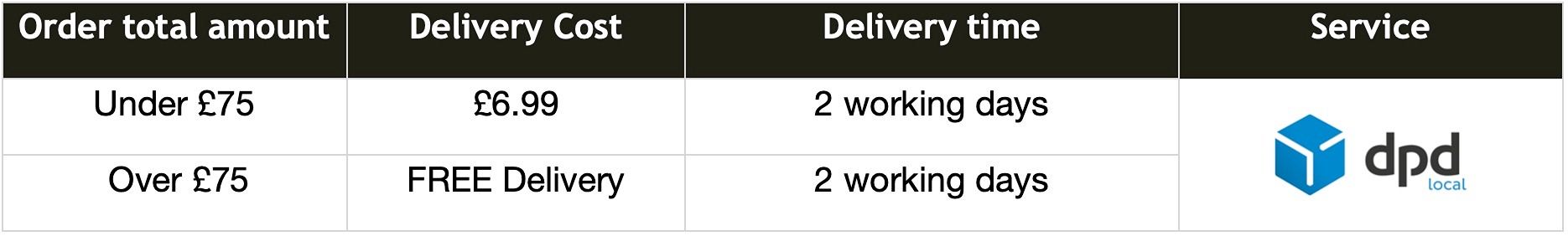 All orders will be dispatched within 2 business days of receipt (unless otherwise advised); an order placed on a Sunday will be collected by DPD the next day and delivered Tuesday.